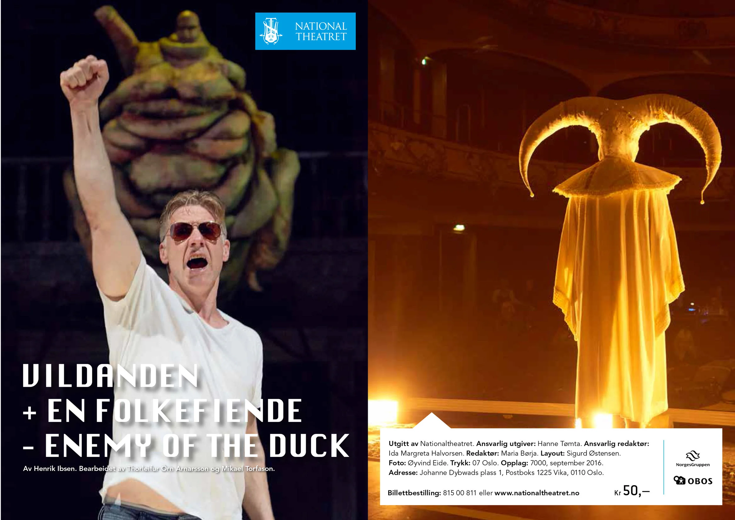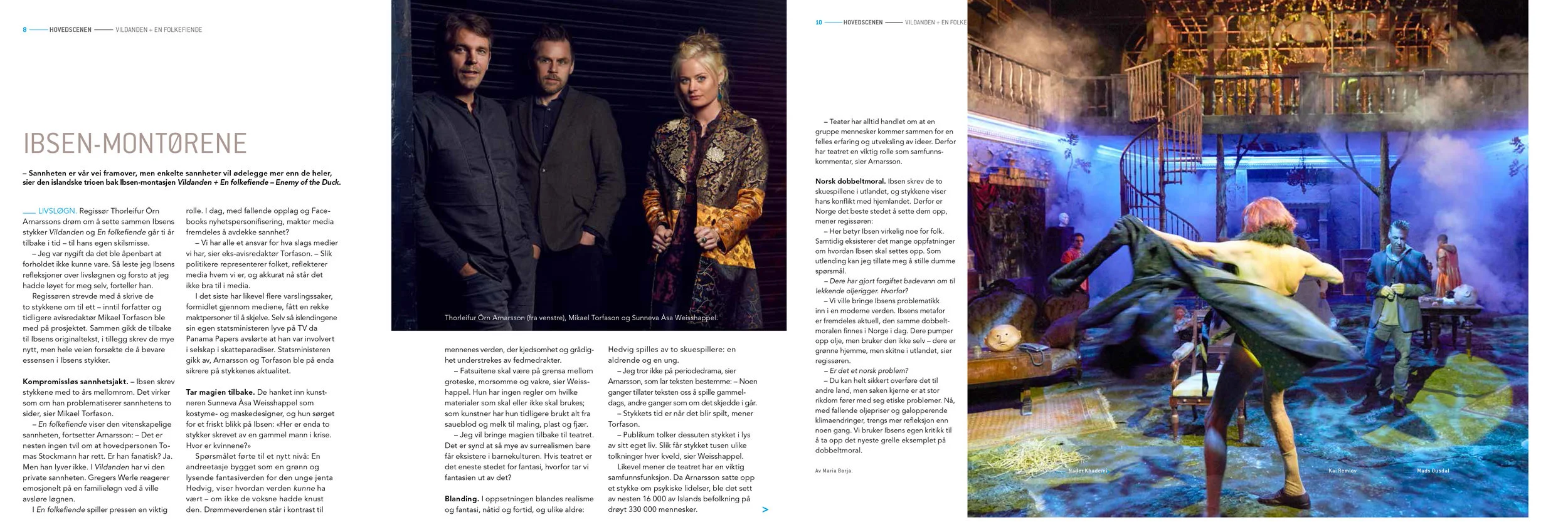 Vildanden + En folkefiende – Enemy of the Duck åpnet Ibsenfestivalen 2016. Til programmet intervjuet jeg intervjuet den islandske trioen bak prosjektet, der Ibsens to stykker Vildanden og En folkefiende – skrevet med to års mellomrom – ble satt sammen til én forestilling. Jeg intervjuet også Kai Remlov, som i rollen som Gamle Ekdal (i rosa parykk!) gjorde sin siste forestilling som fast ansatt skuespiller ved Nationaltheatret.