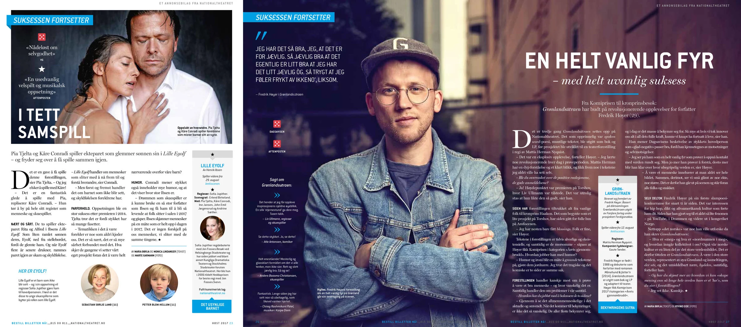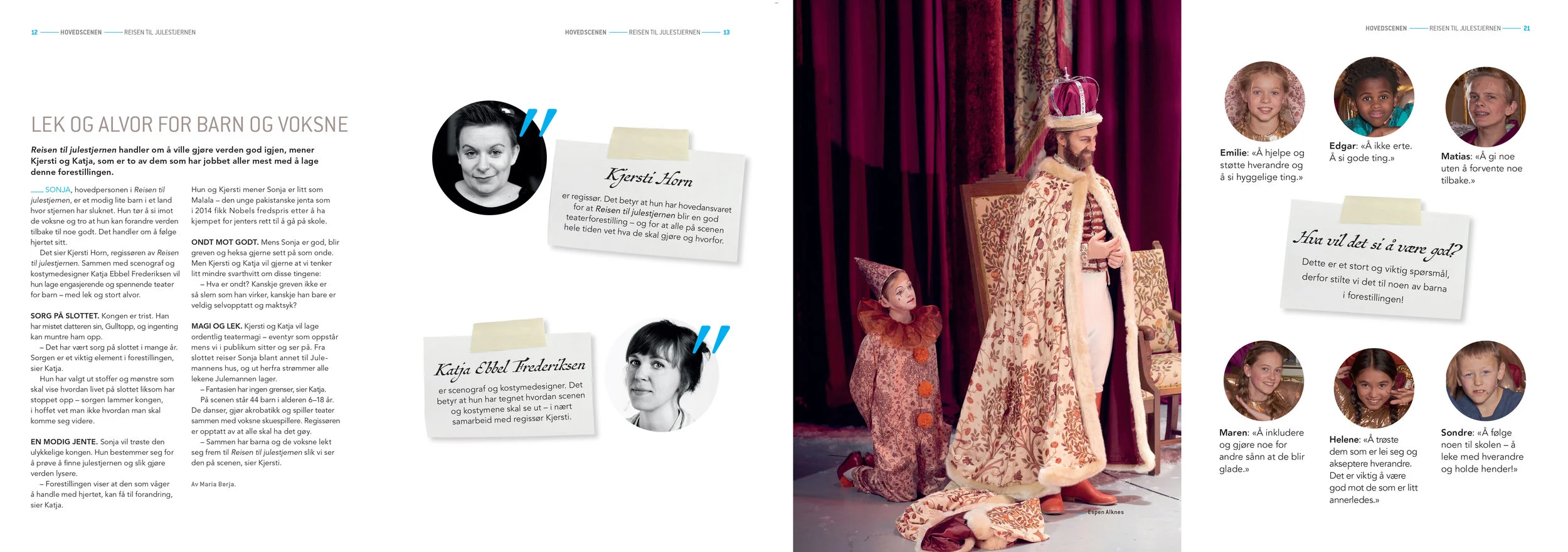 Høsten 2016 var jeg redaktør for programmene til hovedsceneproduksjonene Vildanden + En folkefiende – Enemy of the State og Reisen til julestjernen. Sistnevnte ble satt opp for første gang siden 2010, i regi av Kjersti Horn og med kostymer og scenografi av Katja Ebbel Frederiksen.