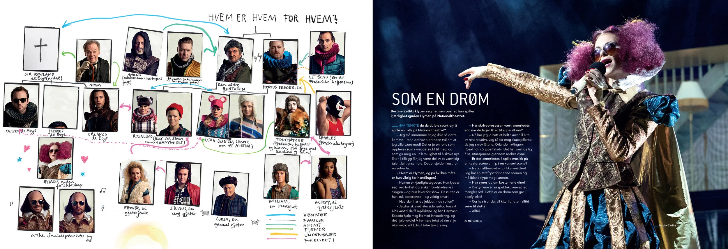 Som dere vil-programmet besto blant annet av et relasjonskart (til venstre) som viser hvem karakterene er i forhold til hverandre. Mitt intervju med Bertine Zetlitz til høyre. Faksimile fra programmet. Design: Sigurd Østensen. Portrettfoto: Øyvind Eide. Forestillingsfoto: Marte Garmann