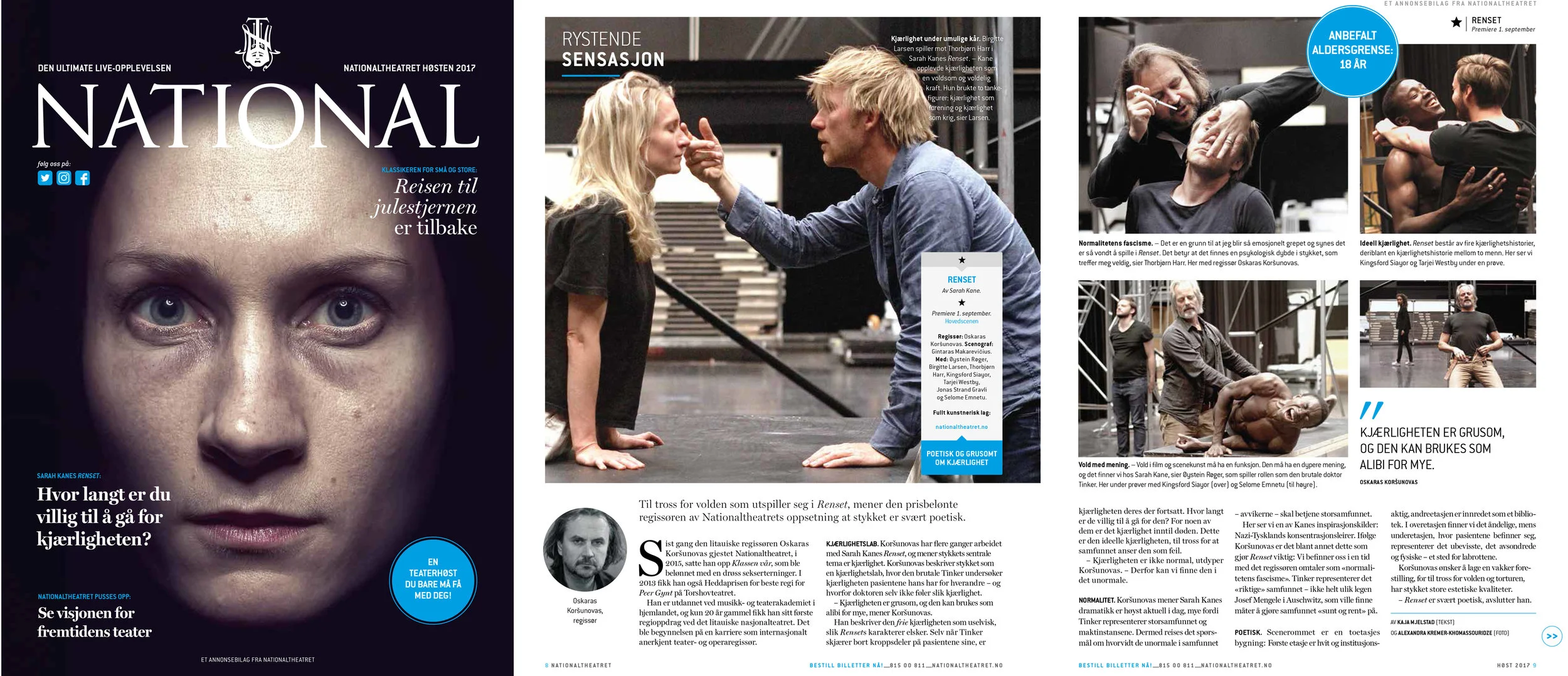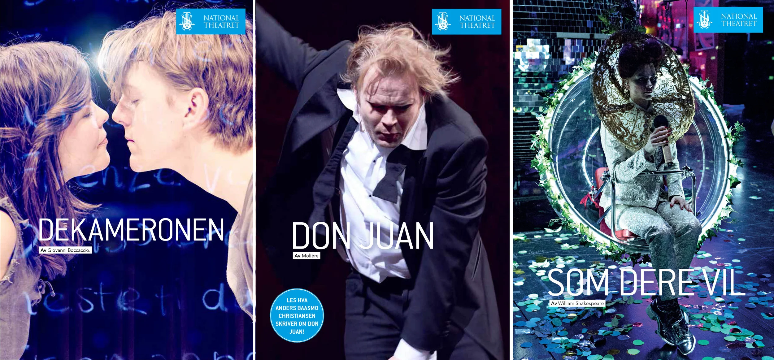 Årene 2016–2017 jobbet jeg som programredaktør for Nationaltheatret. Det innebar å bestille og redigere bakgrunnsstoff om oppsetningene, skrive intervjuer og annet interessevekkende stoff, velge ut bilder og binde innholdet sammen til en fin, helhetlig pakke. Jeg var også redaktør for National magasin, som utkom hvert halvår. Her er faksimiler fra National magasin høsten 2017 og programmet til de tre hovedsceneproduksjonene Dekameronen, Don Juan og Som dere vil.