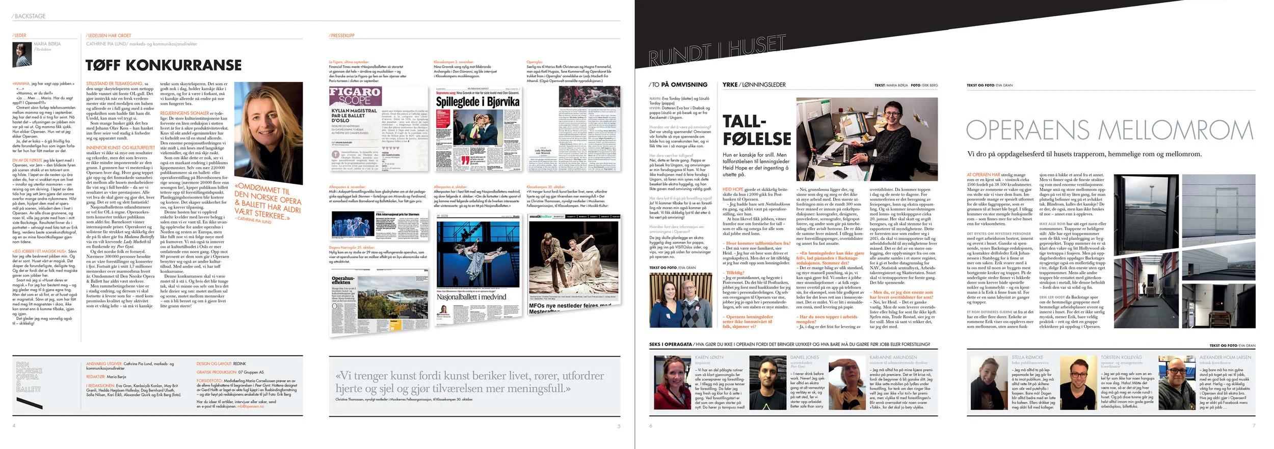 Fra 2013 til 2015 var jeg redaktør for Den Norske Opera & Balletts internmagasin Backstage, et glanset magasin som fire–fem ganger i året utkommer i 1000 eksemplarer. Bladet er en spydspiss i informasjonsarbeidet på huset, der en frivillig redaksjon med representanter fra hele huset står for innholdet sammen med bladets redaktør og husets fotograf. Jeg var med i redaksjonen fra oppstarten i 2010.