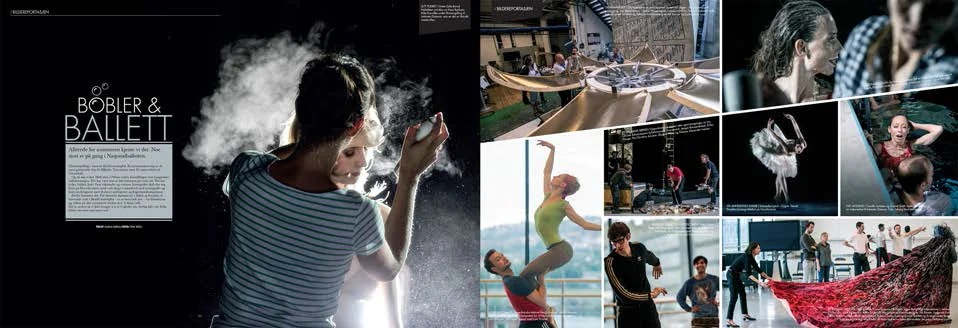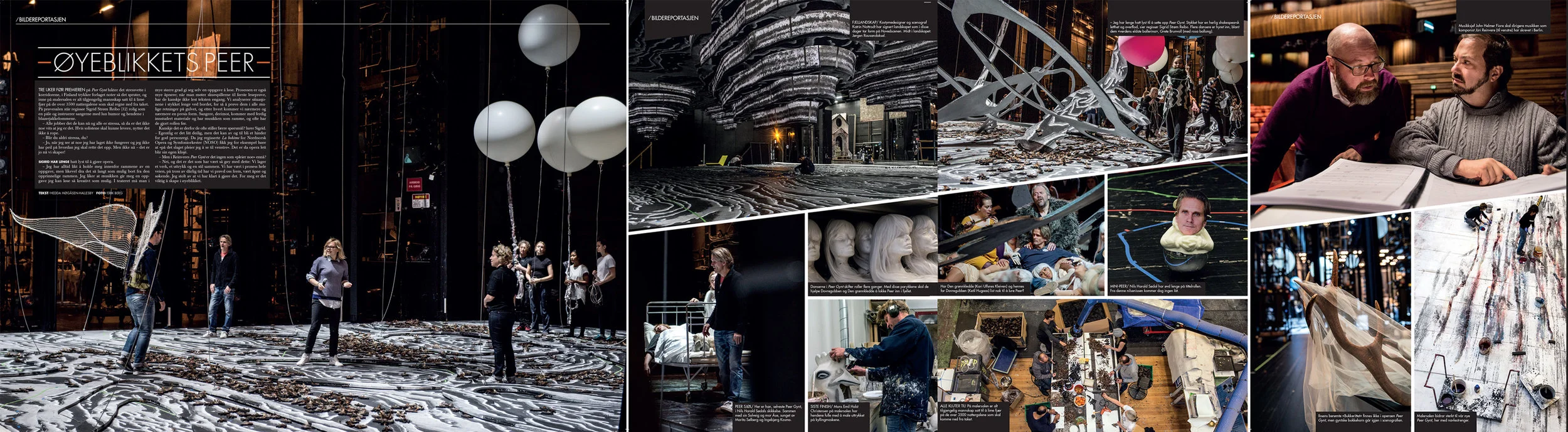 Faksimile av bildereportasje fra produksjonen av Nasjonaloperaens Peer Gynt (over fem sider). Foto: Erik Berg