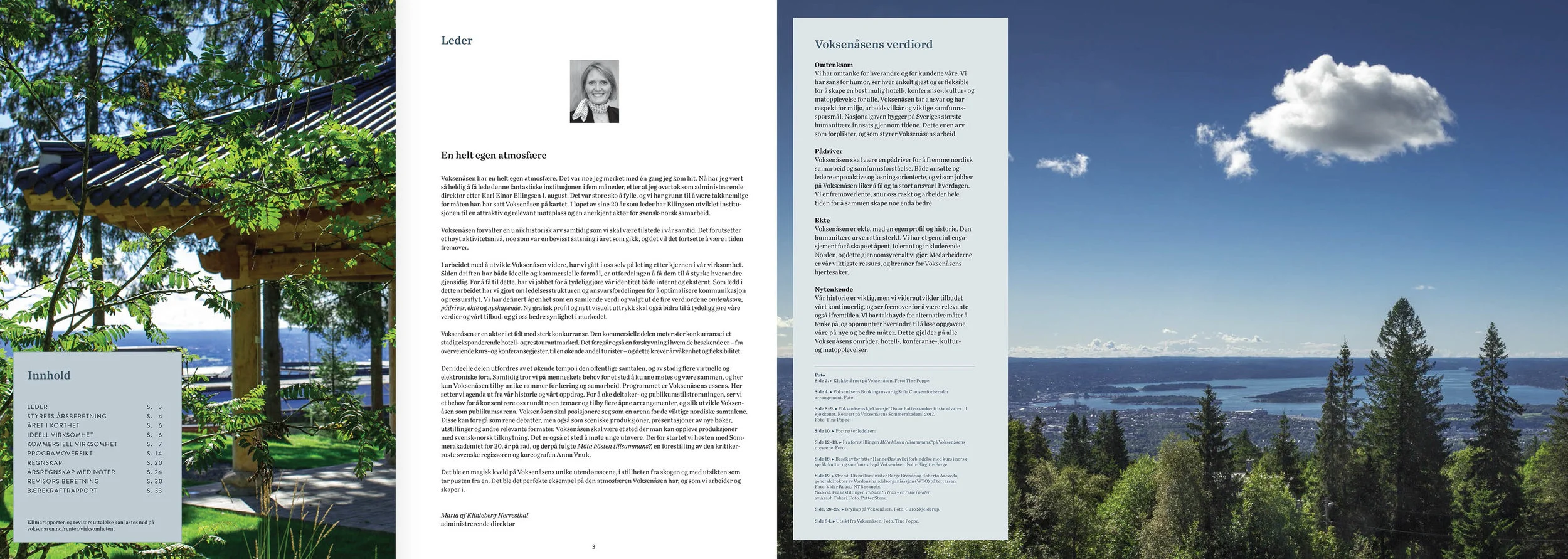 Faksmile av første og siste oppslag i Voksenåsens årsrapport for 2016. Design: Ingun Redalen White