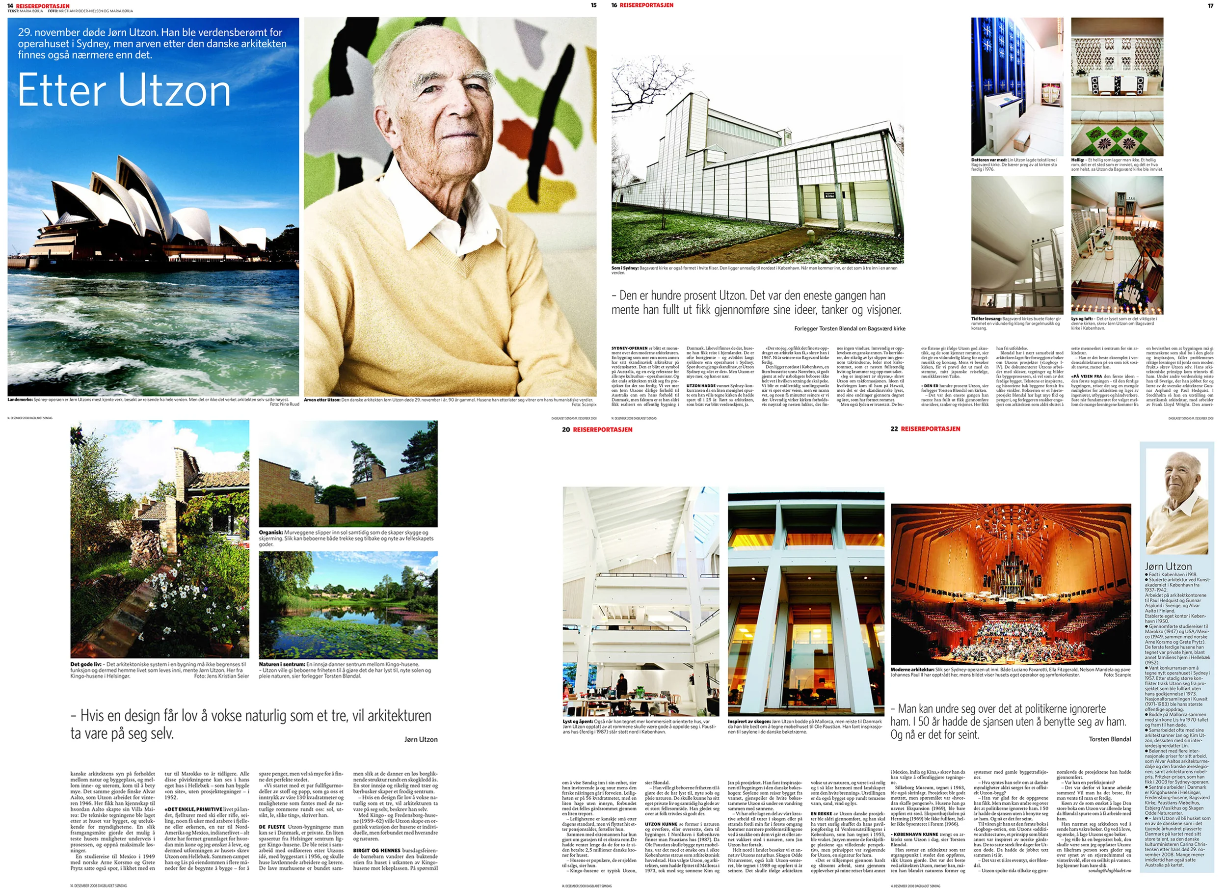 29. november 2008 døde arkitekten Jørn Utzon. Jeg satte meg ned og skrev denne reportasjen, basert på en reise til flere av Utzons danske byggverk samme sommer, som sto på trykk i Dagbladet Søndag: